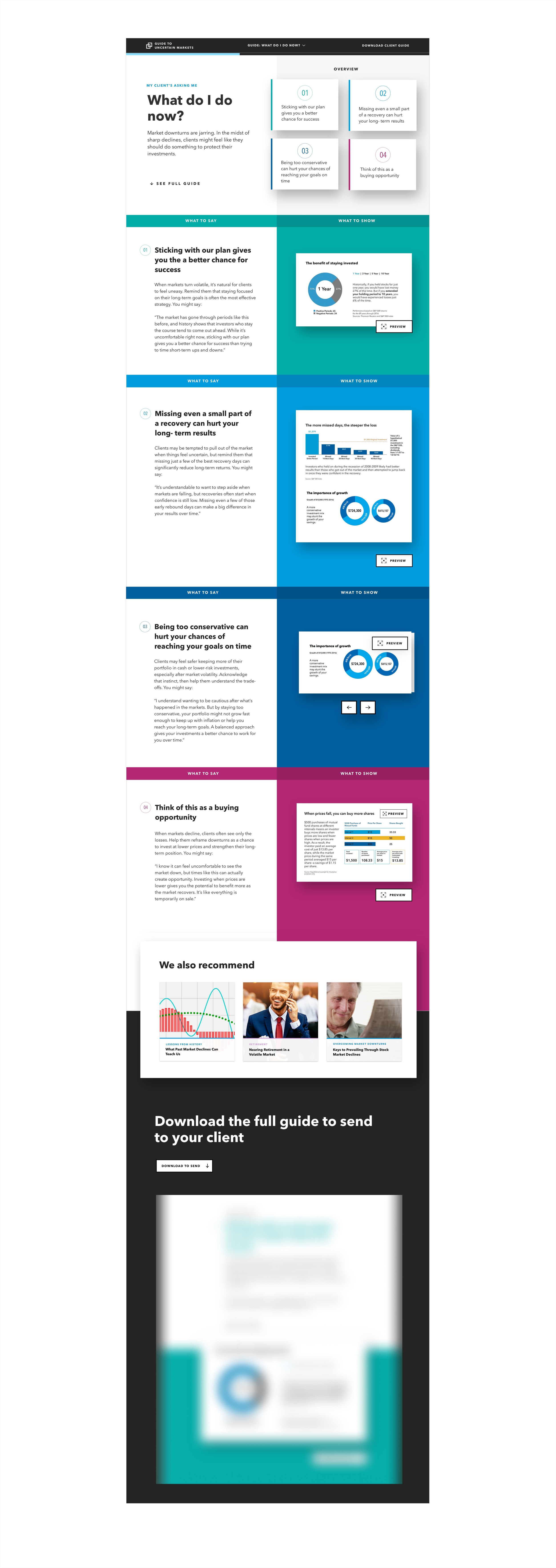 Designed Guide to Uncertain Markets, a digital tool for a Fortune 500 financial firm that helps advisors coach clients through volatility using data-driven investing insights.